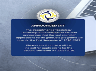ANNOUNCEMENT The Department of Sociology University of the Philippines Diliman announces that the next round of applications for its graduate programs will open in the First Semester AY 2026-2027. Please note that there will be no call for applications for the Second Semester AY 2025-2026…